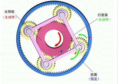 行星輪除了可以繞行星架支承軸旋轉外,在有些工況下,還會在行星架的帶動下,圍繞太陽輪的中心軸線旋轉,這就像地球的自轉和繞著太陽的公轉一樣,當出現(xiàn)這種情況時,就稱為行星齒輪機構作用的傳動方式。